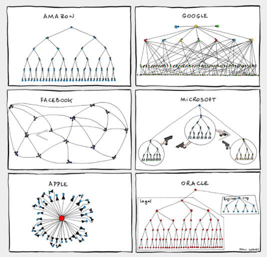 Of course, the classic, as org structure doodles (all grown up into a comic) go, is Manu Cornet’s! (Which manages to be an “org structure chart” that is about power, communication, and org culture.)